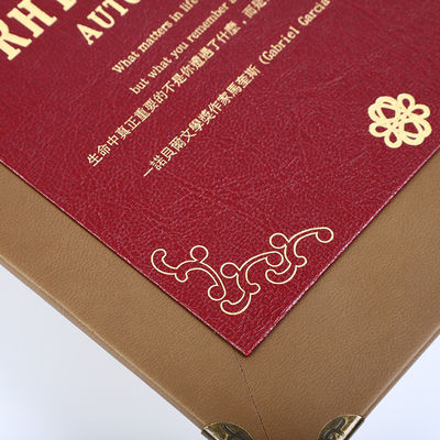 caixas de madeira da forma do livro com superfície de couro e logotipo redondo do metal da espinha 3D